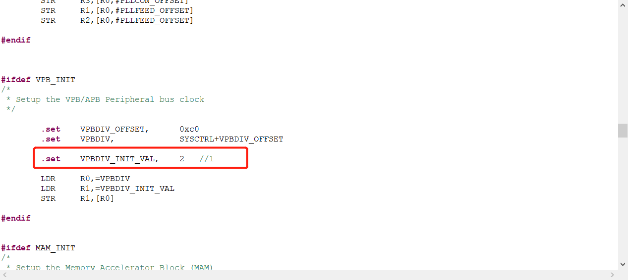 讯享网 #ifdef VPB_INIT /* * Setup the VPB/APB Peripheral bus clock */ .set VPBDIV_OFFSET, 0xc0 .set VPBDIV, SYSCTRL+VPBDIV_OFFSET .set VPBDIV_INIT_VAL, 1 LDR R0,=VPBDIV LDR R1,=VPBDIV_INIT_VAL STR R1,[R0] #endif