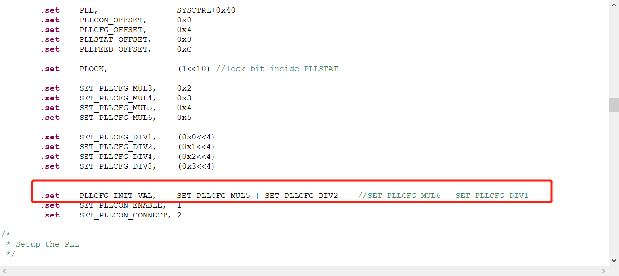 通过代码.set PLLCFG_INIT_VAL, SET_PLLCFG_MUL6 | SET_PLLCFG_DIV1