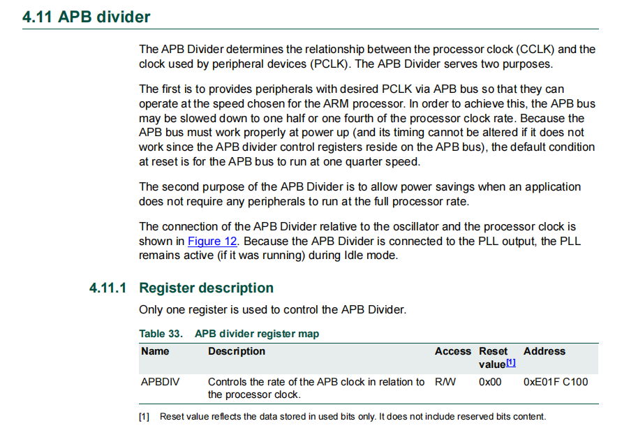 也就是说PCLK是由CCLK分频得到的,分频值由APBDIV确定。