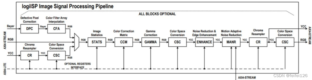 蓝框框里是“去马赛克”单元,包含CAC(Cromatic Aberration Correction色彩失常校正)、降噪滤波器