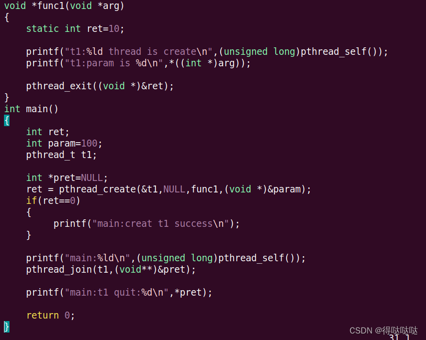 讯享网#include <stdio.h> #include <pthread.h> #include <unistd.h> //int pthread_create(pthread_t *restrict tidp, const pthread_attr_t *restrict attr, void *(*start_rtn)(void *), void *restrict arg); // 返回:若成功返回0,否则返回错误编号 int g_data=0; void *func1(void *arg) { printf("t1:%ld thread is create\n",(unsigned long)pthread_self()); printf("t1:param is %d\n",*((int *)arg)); while(1){ printf("t1:%d\n",g_data++); sleep(1); if(g_data==3)//随缘达成条件,因为内存共享。=3时处于别的线程 pthread_exit(NULL); } } void *func2(void *arg) { printf("t2:%ld thread is create\n",(unsigned long)pthread_self()); printf("t2:param is %d\n",*((int *)arg)); while(1){ printf("t2:%d\n",g_data++); sleep(1); } } int main() { int ret; int param=100; pthread_t t1; pthread_t t2; ret = pthread_create(&t1,NULL,func1,(void *)¶m); if(ret==0) { printf("main:creat t1 success\n"); } ret = pthread_create(&t2,NULL,func2,(void *)¶m); if(ret==0) { printf("main:creat t2 success\n"); } printf("main:%ld\n",(unsigned long)pthread_self()); while(1){ printf("main:%d\n",g_data++); sleep(1); } pthread_join(t1,NULL); pthread_join(t2,NULL); return 0; }