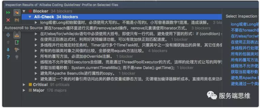 《阿里巴巴 Java 开发手册》是阿里巴巴集团技术团队的集体智慧结晶和经验总结, 经历了多次大规模一线实战的检验及不断完善, 系统化地整理成册。当然,规范只能提供参考,我们还需要工具来帮忙我们实现了实时检测。目前,Alibaba Java Code Guidelines 插件实现了开发手册中的的 53 条规则,大部分基于 PMD 实现,其中有 4 条规则基于 IDEA 实现,并且基于 IDEA Inspection 实现了实时检测功能。部分规则实现了 Quick Fix 功能。目前,插件检测有两种模式:实时检测、手动触发。详细使用文档,参考:https://github.com/alibaba/p3c/blob/master/idea-plugin/README_cn.md