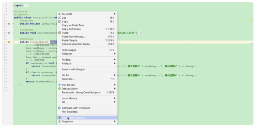 有的时候,我们需要梳理业务逻辑或者阅读源码。从中,我们需要了解整个调用链路,反向生成 UML 的时序图是强需求。其中,SequenceDiagram 插件是一个非常棒的插件。详细使用文档,参考:https://plugins.jetbrains.com/plugin/8286-sequencediagram