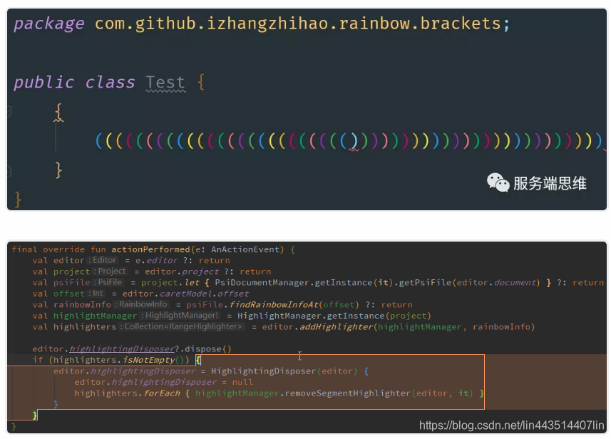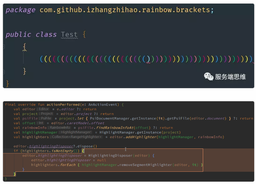 Rainbow Brackets 插件可以实现配对括号相同颜色,并且实现选中区域代码高亮的功能。详细使用文档,参考:https://plugins.jetbrains.com/plugin/10080-rainbow-brackets
