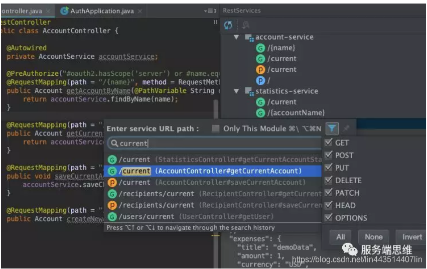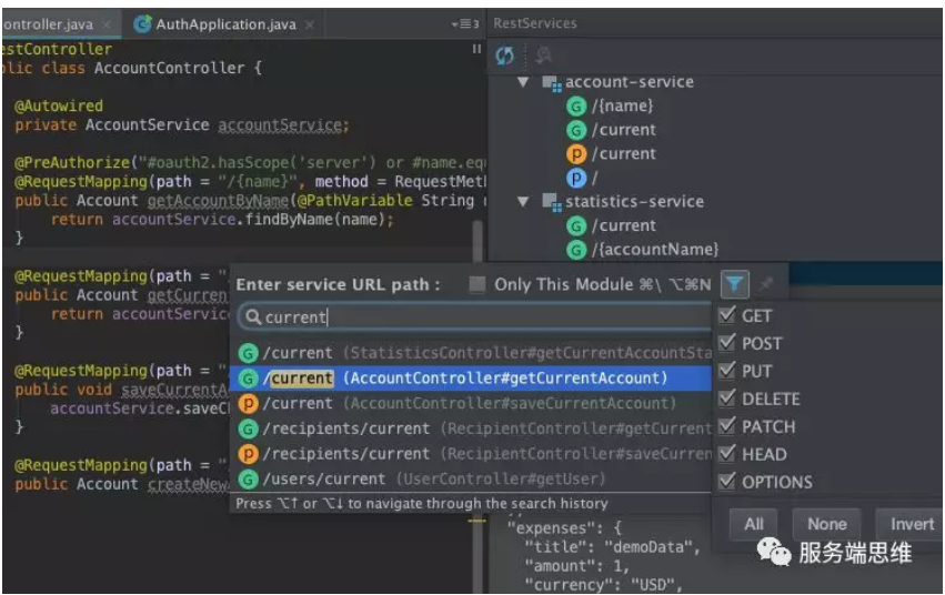 根据 URL 直接跳转到对应的方法定义 ( Ctrl \ or Ctrl Alt N ); 提供了一个 Services tree 的显示窗口; 一个简单的 http 请求工具; 在请求方法上添加了有用功能: 复制生成 URL;,复制方法参数... 其他功能: java 类上添加 Convert to JSON 功能,格式化 json 数据 ( Windows: Ctrl + Enter; Mac: Command + Enter )。