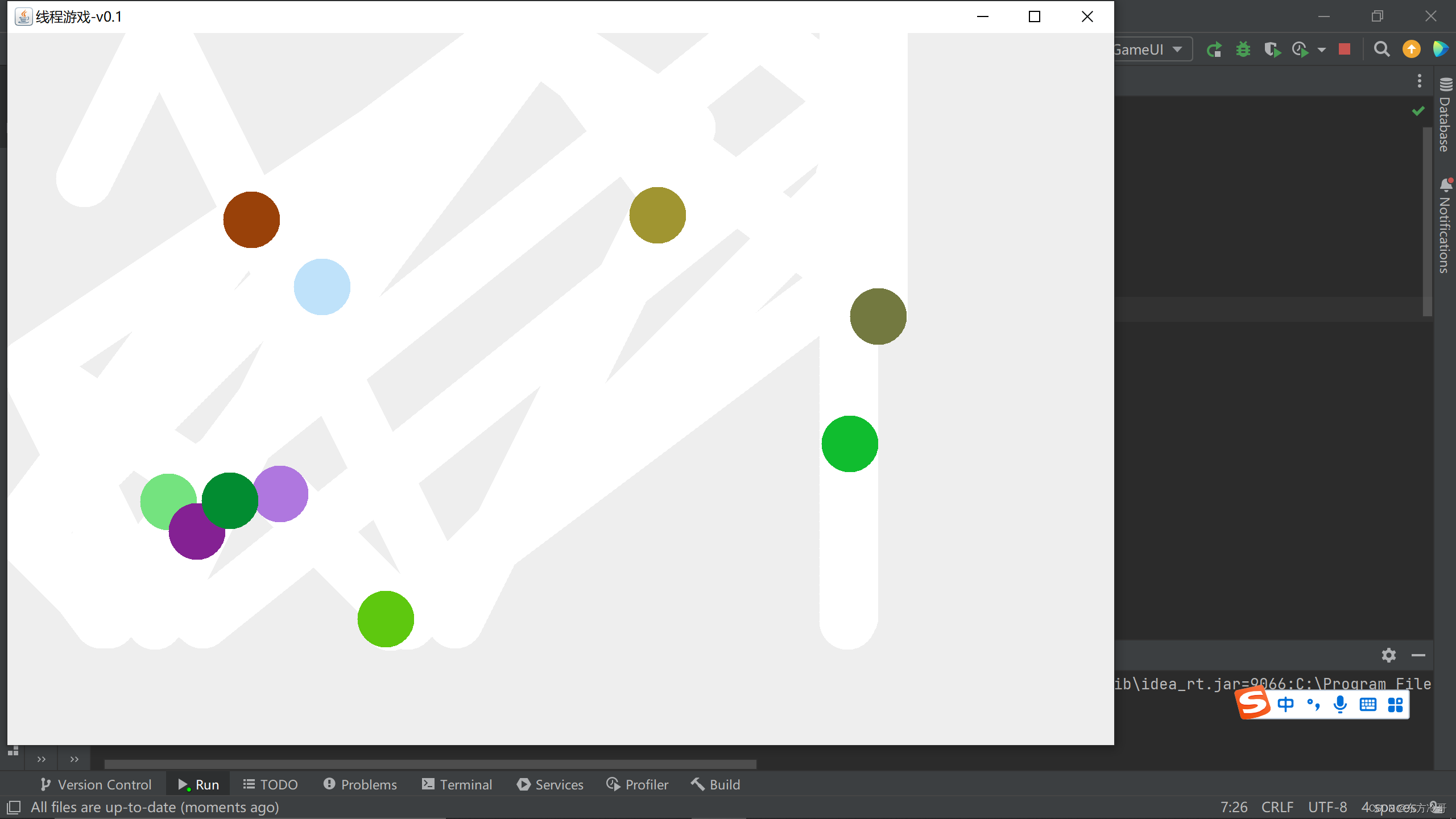 讯享网public class GameUI extends JFrame { public void initUI(){ setTitle("线程游戏-v0.1"); setSize(800,600); setVisible(true); setDefaultCloseOperation(EXIT_ON_CLOSE); ball1 = new Ball_1(this); ball1.start(); for(int i=0;i<10;i++){ ball2 = new Ball_2(this); ball2.start(); } } Ball_1 ball1; Ball_2 ball2; public void paint(Graphics g){ super.paint(g); } public static void main(String[] args){ new GameUI().initUI(); } }