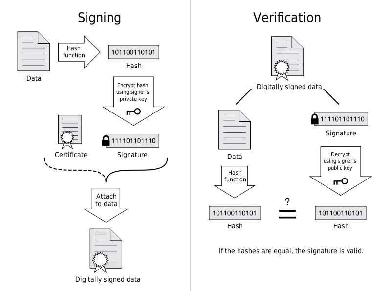 非对称密钥除了用来加密,还可以用来进行签名。因为私有密钥无法被其他人获取,因此通信发送方使用其私有密钥进行签名,通信接收方使用发送方的公开密钥对签名进行解密,就能判断这个签名是否正确。