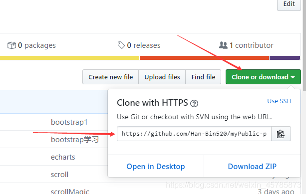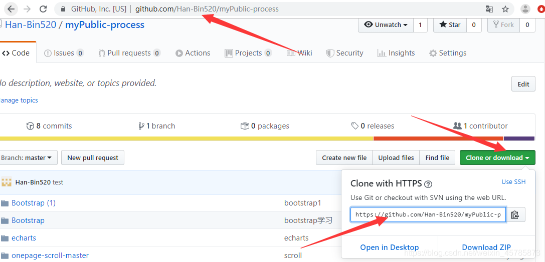 比如我们要从克隆的远程仓库托管在github上,地址为:https://github.com/Han-Bin520/myPublic-process.git,这是一个公开的项目