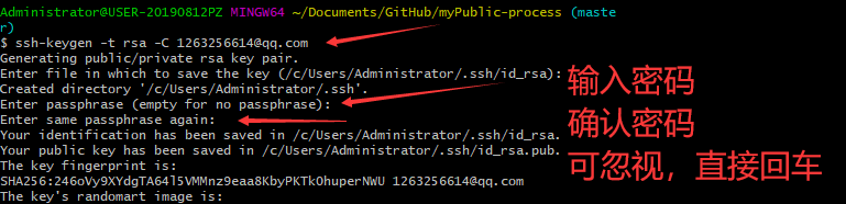 $指定目录: C:\指定目录\(若在此处不输入路径,而直接按回车,则ssh keys生成后存放在默认路径)