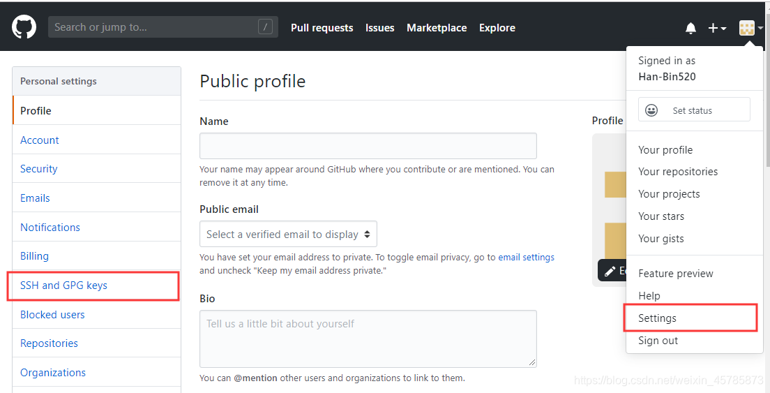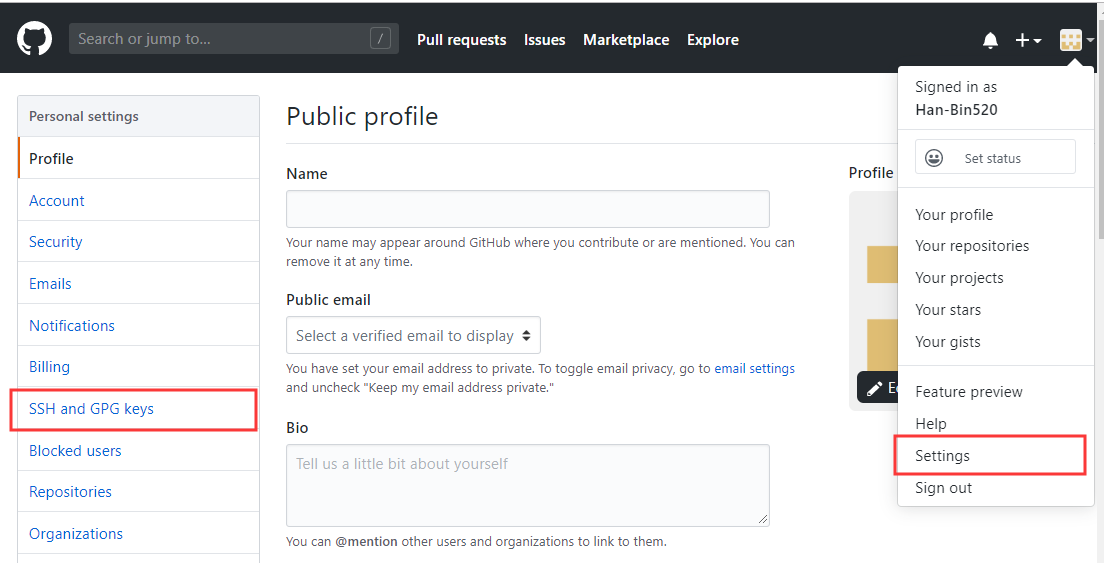 进入Settings后,点击SSH and GPG keys,然后再点击右上角添加新密钥按钮New SSH key,