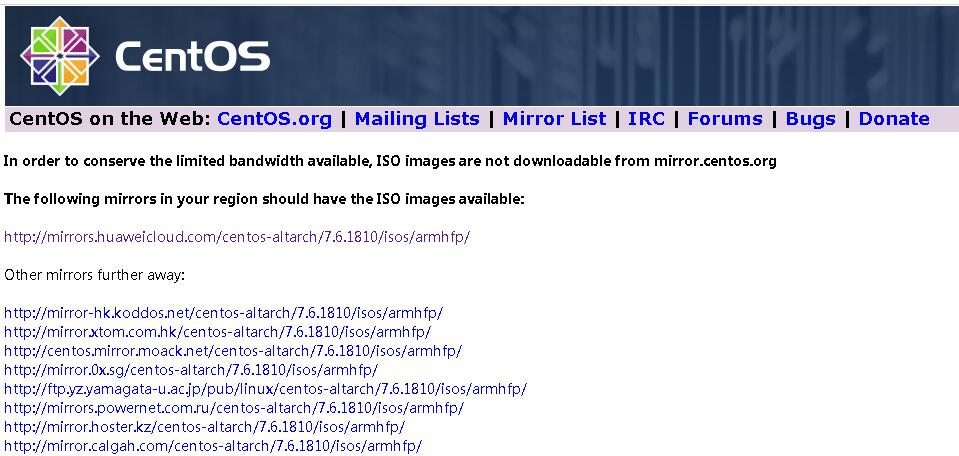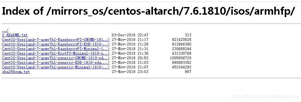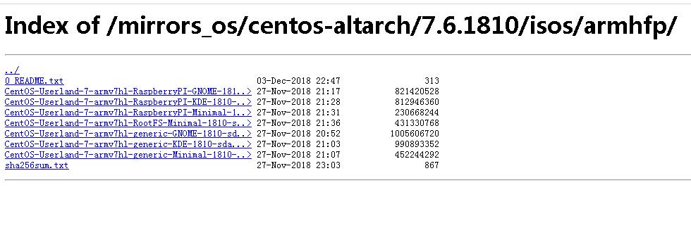 首先要烧录镜像到一张SD卡中,CentOS系统镜像下地址:http://mirror.centos.org/altarch/7/isos/armhf,注意树莓派属于ARM处理器,别选错了。