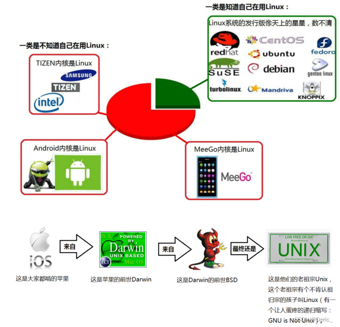 通过下面的这个长久流传的图片,应该能比较明显的看出Linux系统在操作系统里的地位了吧,适用的领域根据上面说的一大堆总结如下:应用服务器/数据库服务器/网络服务器/虚拟化云计算/嵌入式领域/个人PC/移动手机,所以我们学习Linux系统的相关操作和知识是非常有必要的。