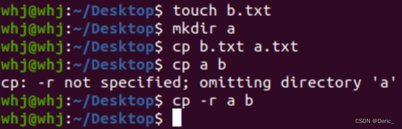 讲述了如何对命令的选项进行查询后,我们来实际操练一下怎么对文件进行复制。通过创建b.txt文件和a文件夹,分别复制生成a.txt文件和b文件夹,会发现如果不加上 -r 递归的选项则无法对文件夹执行操作。