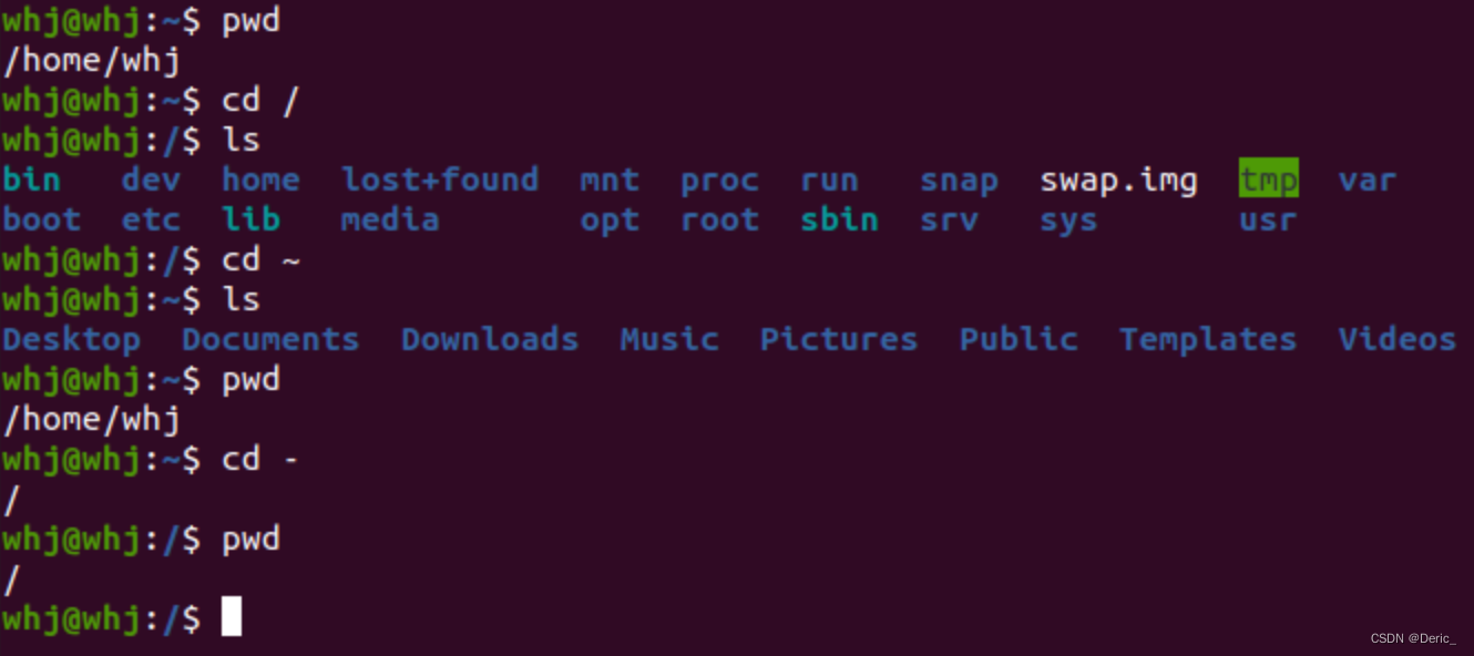 举例:一开始进入家目录,用pwd查询验证后,切换为根目录可以用ls命令看到根目录下的文件目录,再去切换回家目录,再查看家目录下的文件;使用cd .. 切换到上一次所在的目录,最后用pwd验证是根目录/。