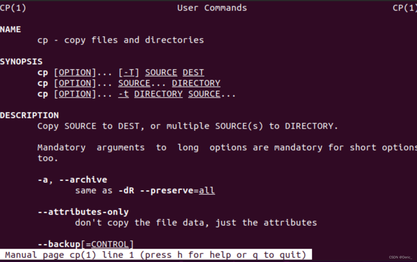 注意便捷提醒:这里有的选项在上面已经有多次出现过了,例如-f 其实就是force强制去执行,-i就是提示是否确认,这个就是interactive选择的英文意思,而-r则是recursive递归的英文意思可以用于多个目录文件,而-v就是verbose,英文单词详细。(这些都可以利用前面讲的显示命令帮助信息的方法来查看,推荐使用man command 来进行详细信息的查询,例如下图输入man cp后对cp命令的选项信息进行了解)