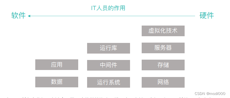 最右边的【虚拟化】、【服务器】、【存储】、【网络】是制作一个软件的基础条件,除了虚拟化技术其他都是硬件,所以在云计算领域中,这块被称为基础设施。它们在机房都能看到。
