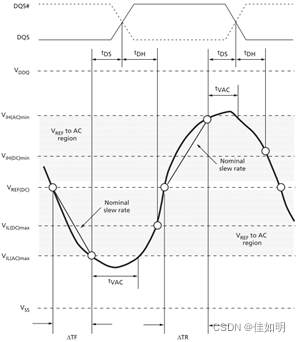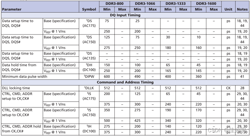 之所以如此定义SSTL_15的AC和DC门限,有些工程师可能会产生疑问:这样岂不是说AC135的门限要求就比AC175的门限要求更宽松呢?实际上并不是这样,而是要结合了建立保持时间的要求来看。也就是说AC175、AC150、AC135、AC125这些门限的定义都对应着不同的建立保持时间要求。表XX所描述的就是DDR3芯片的建立、保持时间要求。其中Base(specification)表示以AC175、AC150等AC门限为标准测量的建立时间tDS要求,而VREF@1V/ns表示1V/ns的slew rate情况下以VREF为标准测量的建立时间、保持时间要求。