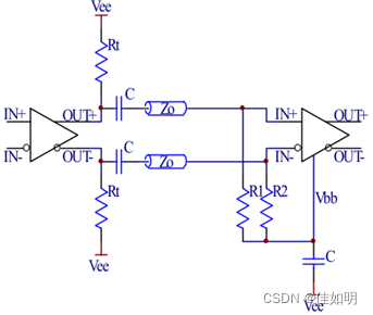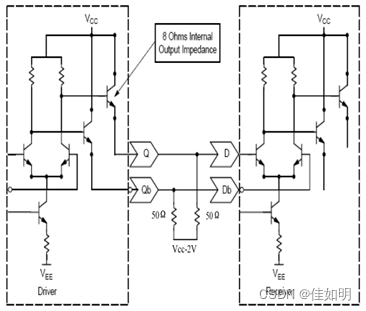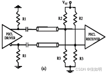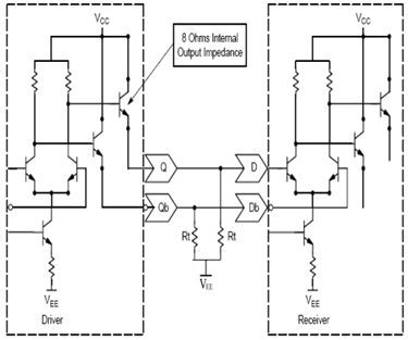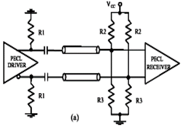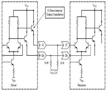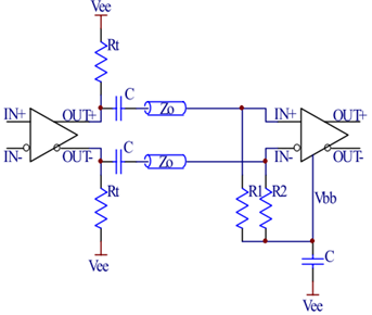 PECL电路的输入端和输出端都有相等的静态直流电压(Vcc-1.3V),只要电源电压相同,PECL电路之间的输出和输入可以直流耦合传输信号的。
