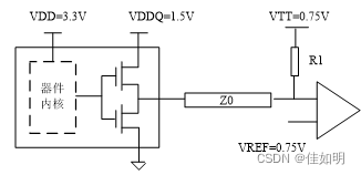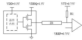 - 芯片输出buffer供电电压VDDQ,JEDEC规定了HSTL电平的VDDQ典型值为1.5V这就决定了其输出电压的摆幅0~1.5V。
