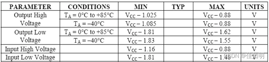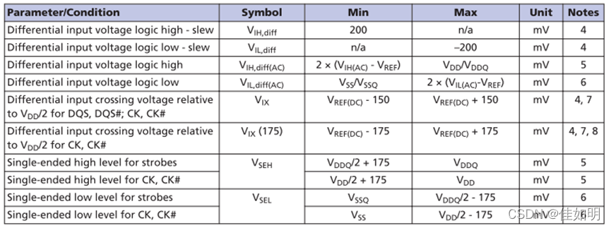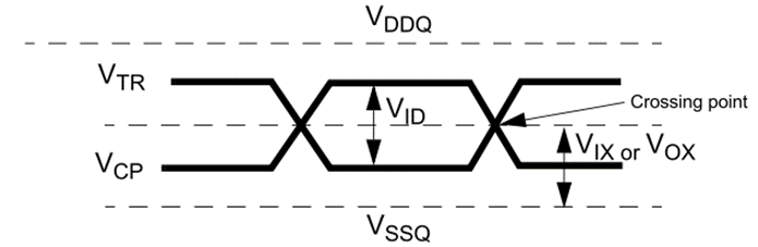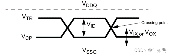 HSTL电平也支持差分输入,相比单端信号需要额外关注的参数为差分幅值VDIF(AC)\ VDIF(DC)、共模噪声VCM(DC)、以及交叉点的范围VX如下表所示: