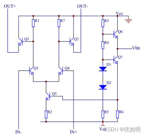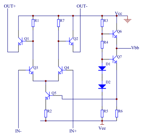 3、Q6、Q7和二极管D1、D2组成带温度补偿的偏置电源(参考源),它使差分放大器可靠地工作在线性放大区 Vbb即等于输入、输出的共模电平,典型值为Vbb=Vcc-1.3V 。