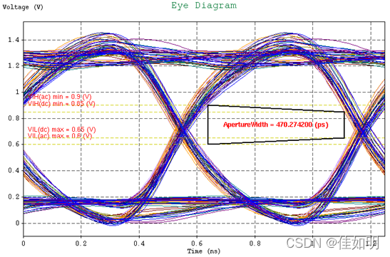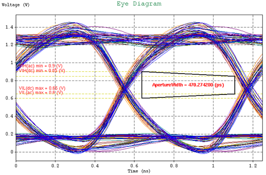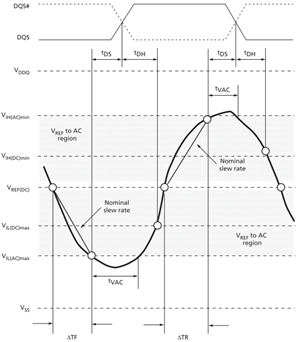 对于数据信号的建立时间tDS的测量是测量VIL(AC) 、VIH(AC)到DQS和DQS#的交叉点的延时,而保持时间tDH是测量从DQS和DQS#的交叉点到VIL(DC) 、VIH(DC)的延时。基于这种对建立保持时间的测量方法,我们可以得到DDR3眼图的一般测量方法。以VIL(AC) 、VIH(AC)和高低电平起始的最后一个交点做垂直于时间轴的直线,以VIL(DC) 、VIH(DC)和高低电平结束的第一个交点做垂直于时间轴的第二条直线。第一条直线和VIL(AC) 、VIH(AC)的两个交点以及第二条直线和VIL(DC) 、VIH(DC)的两个交点,这四个点构成一个梯形,我们便可以以此梯形为基准来描述眼图的眼宽和噪声裕量。
