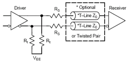 需要注意的是 ECL电路的输入端不一定有内部偏置,因此需要在芯片外部提供额外的供电或使用电阻网络通过现有的电源分压得到; ECL电路一定是射极开路输出的,必须外接终端匹配RL做为负载。