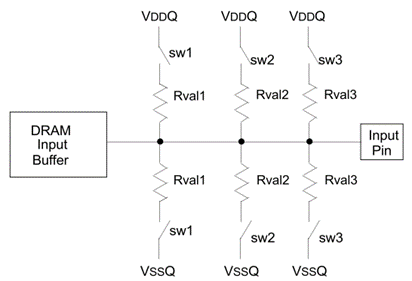 由于VDDQ电平的降低使SSTL_2的高低电平噪声裕量都有所降低,在一定程度上提高了对信号完整性的要求。DDR2存储器中都设置ODT(on die terminate),即存储器芯片上的并联端接,端接阻值有50、75、150ohm三种类型,用户可以在MR(mode register)寄存器中进行设置,DDR2接收buffer内部的ODT电路结构如下: