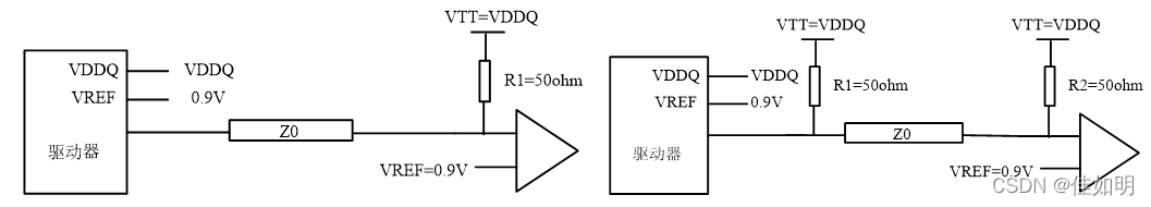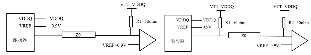 其VREF电平来说,对称端接VREF = VDDQ/2,此时VTT = VDDQ/2;非对称端接中VREF =0.9V,此时VTT =VDDQ。并联端接指的就是末端接上拉电阻到VTT,双并联端接指的是源端末端都需要上拉电阻到VTT。