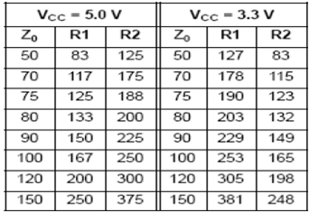 通常我们的设计都是在50ohm传输线系统中,因此R1和R2的选择就比较固定。在Vcc=5V时,R1 = 83ohm,R2 =125ohm;在Vcc=3.3V时,R1 = 127ohm,R2 =83ohm。我们会发现在Vcc = 5V和Vcc =3.3V时R1和R2的阻值正好是颠倒过来的,这有利于我们快速的进行PECL电平的阻抗匹配设计。电阻按5%的精度选取,在3.3V 供电时, R1 为130Ω,R2 为82Ω。而在5V 供电时,R1为82Ω,R2 为130Ω(125Ω)。