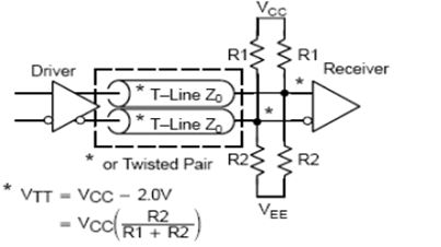1.输出并联端接(50Ω)接口,辅助电源Vcc-2V ,如右图所示这种方法性能最好,芯片的外接元件仅2个电阻,输出级的功耗也最小。但要增加一个Vcc-2V的电源,增加了系统的复杂程度。现很少采用。