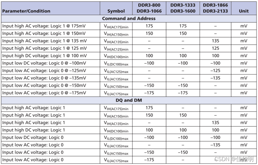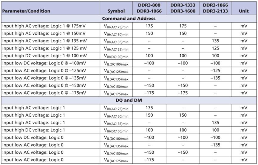 而SSTL_15电平不仅参考VREF定义了±100mV的DC输入门限,而且还根据速率等级的不同定义了多个AC输入门限标准。对于地址控制、命令信号速率在800Mbps到1600Mbps定义了AC150和AC175两种输入门限VREF±150mV、VREF±175mV,当速率超过1600Mbps后则定义了AC125和AC135两种输入电平门限VREF±125mV、VREF±135mV;对于数据信号速率在800Mbps~1066Mbps时使用AC150和AC175门限VREF±175mV,1333Mbps~1600Mbps时使用AC150门限VREF±150mV,当速率在1866Mbps~2133Mbps是使用AC135门限VREF±135mV,详细内容参见下表。