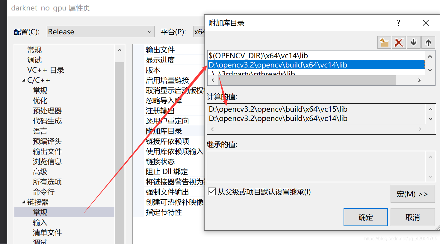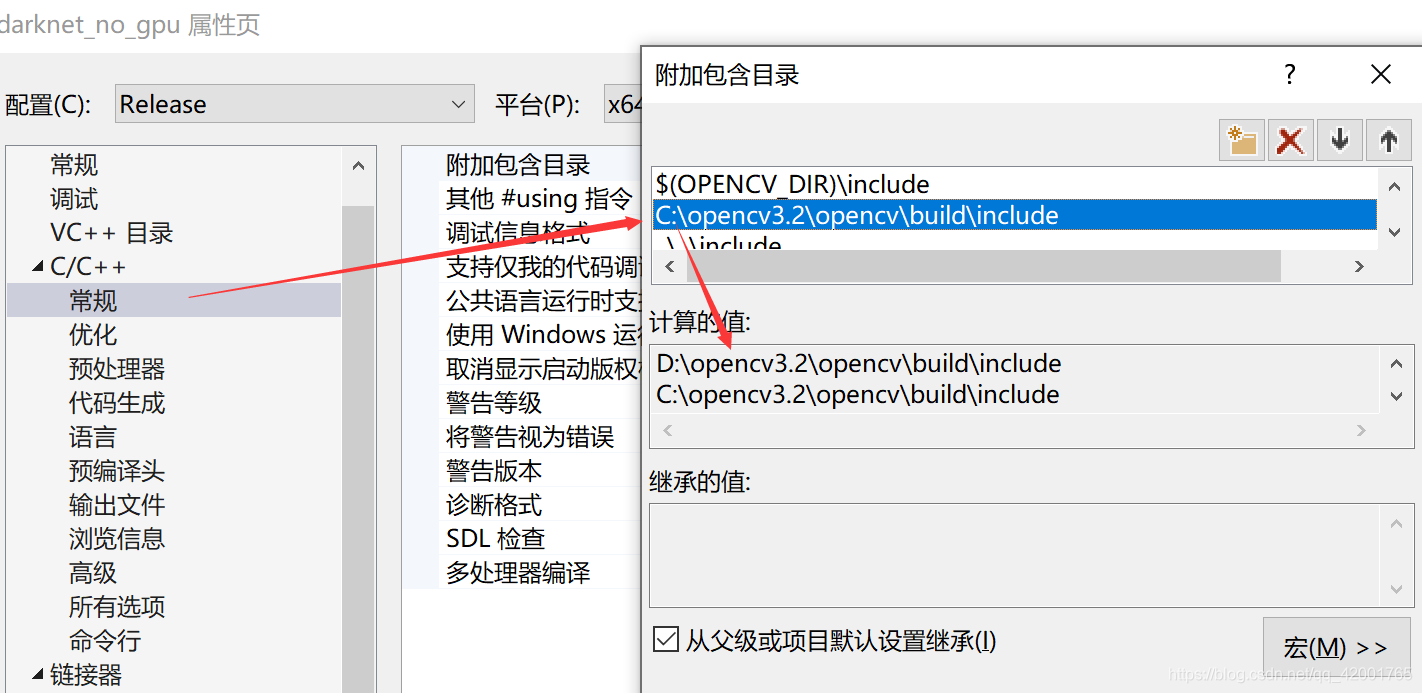 3.因为我安装的opencv是3.2而且安装在D盘下,所以得在项目属性里更改opencv的路径