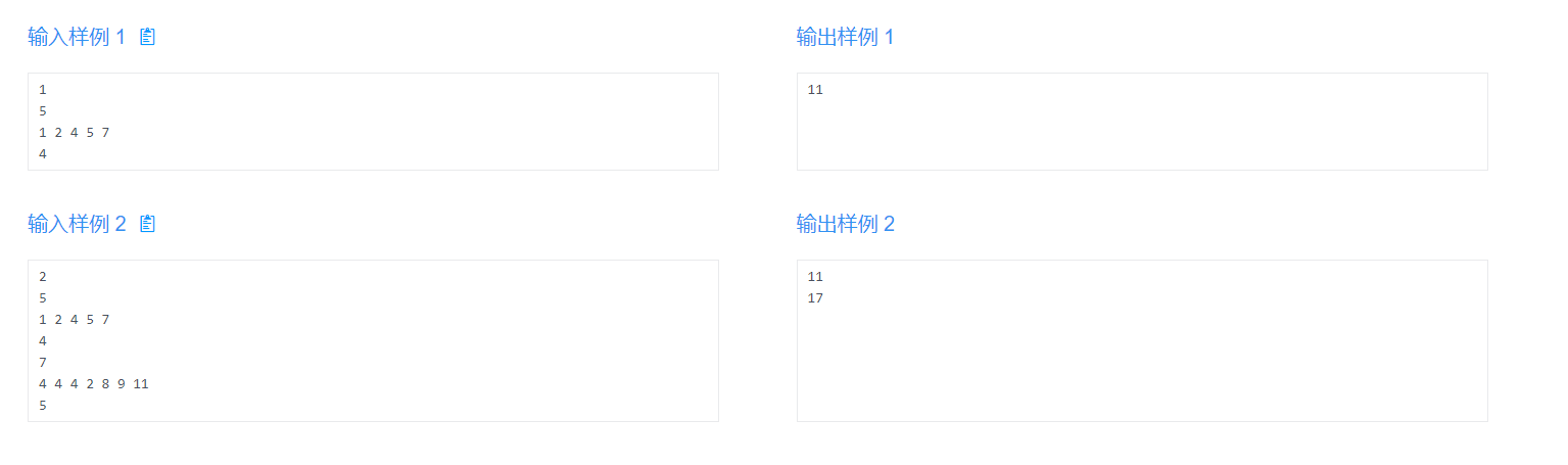 输入有多组样例,第一行是一个整数T,表示样例个数。接下来每组样例的第一行是一个整数n,表示将要洗澡的人数,第二行有n个整数ai,表示第i个人抵达浴室的时间,最后一行是一个整数b,表示一个人洗澡所需的时间。1≤T≤250,1≤n≤600,0≤ai≤10000,1≤b≤1500。
