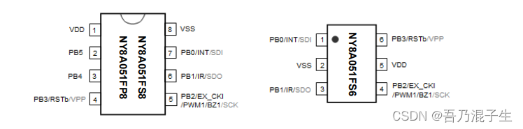 NY8A051F是一款基于EPROM的8位MCU,适用于基于I/O的应用,如遥控器,风扇/灯控制器,游戏控制器,玩具和各种控制器。NY8A051F采用先进的CMOS技术,为客户提供低成本、高性能的卓越解决方案。NY8A051F采用Risc架构,提供55条指令。除程序分支和跳过指令需要两个指令周期外,所有指令都在一个指令周期内执行。因此,NY8A051F非常适合那些复杂但需要紧凑程序大小的应用。由于NY8A051F定位于I/O型应用,它可以为需要丰富输入输出功能的应用提供6个1/O引脚。此外,每个I/O引脚可以通过编程具有额外的功能,如高拉/低拉电阻和开漏输出类型。此外,NY8A051F内置红外(IR)载波发生器,具有可选的红外载波频率和极性,适用于需要远程控制功能的应用。NY8A051F还提供2组定时器,可作为基于系统振荡的定时定时器或带有外部触发时钟的事件计数器。此外,NY8A051F提供1组8位分辨率脉宽调制(PWM)输出和蜂鸣器输出,以驱动电机/LED和蜂鸣器。NY8A051F采用双时钟振荡机构,内部电阻/电容振荡器可产生高振荡或低振荡。此外,NY8A051F基于双时钟机制,提供正常模式、慢速模式、待机模式和停机模式等多种工作模式,以节省功耗,延长电池使用寿命。当NY8A051F工作在待机模式和停机模式时,各种事件会发出中断请求,并可以唤醒NY8A051F进入正常模式和慢速模式,以便处理紧急事件。