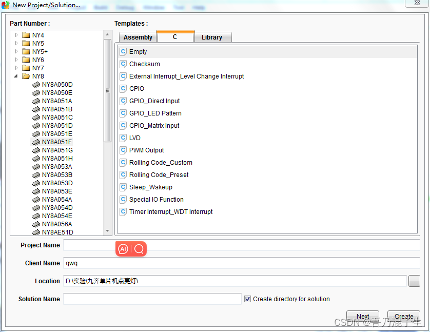 这里我们选择NY8A051F芯片,选择C默认的Empty即可