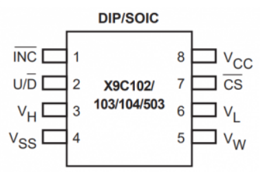 | Wiper Down | 其实就是减少电阻的意思,当CS引脚为低电平,U/D引脚为高电平,INC引脚为下降沿时,电阻阻值固定减少1010欧姆 |