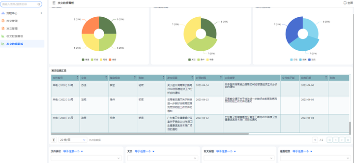发文数据看板是指部门或机构根据发文管理的流程,对所有发文进行信息统计和分析得到的结果。通过发文数据看板可以实时展示所有发文的信息,如发文数量、类型、发文统计、处理状态等等,也能够较为方便地进行业务趋势的预测和调整。