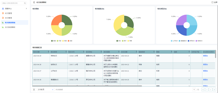 收文数据看板是指部门或机构根据收文管理的流程,对所有收文进行信息统计分析得到的结果。通过收文数据看板,可实时展示所有收文的信息,如收文数量、来源、类型、处理状态等,同时也能够更加方便地进行业务趋势的预测和调整。