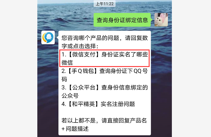 在「腾讯客服」公众号,对话框内输入“查询身份证绑定信息”,回复相应的序号就可以查询了,微信的话回复1就可以了,还可以查询和公众号绑定。大家想要查询的时候按照操作提示就可以了。