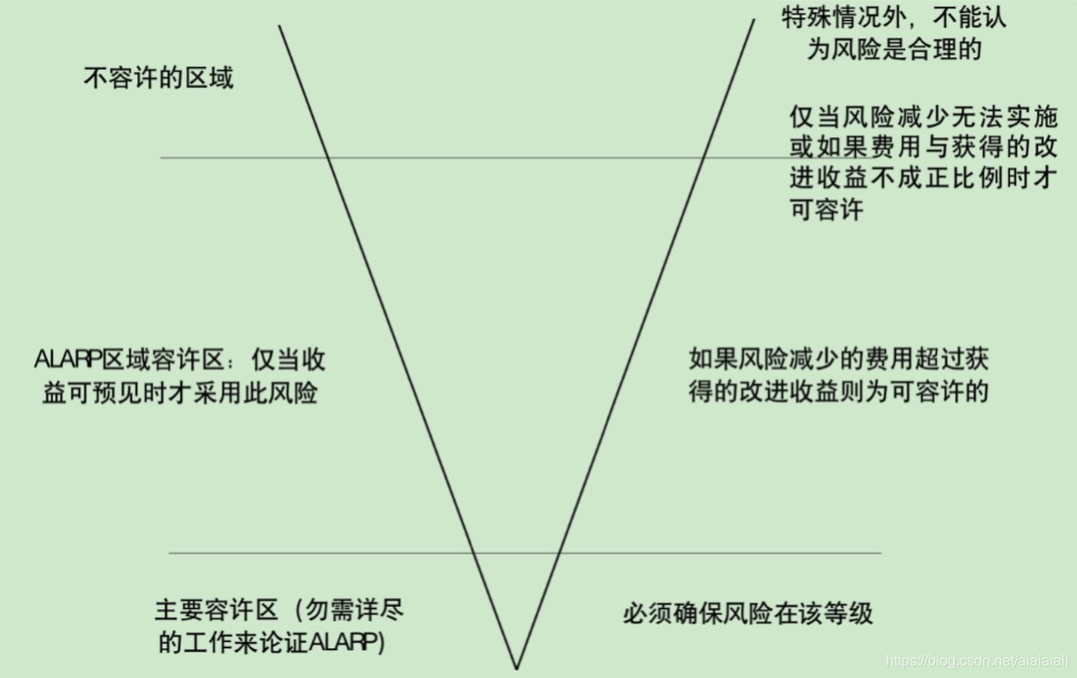 - 最上边的区域规定了不容许的风险等级。风险很大且结果太不可接受,因此在任何场合它们都是不容许的,也不能认为它们是合理的。如果风险等级不能减小到此范围以下就不能投入运营。