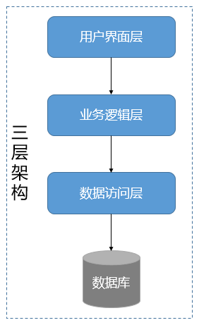 在软件架构中,经典三层架构自顶向下由用户界面层、业务逻辑层、数据访问层组成。在提出该分层架构的时代,多数系统往往较为简单,本质上都是一个单体架构的数据库管理系统。这种分层架构有效地隔离了业务逻辑与数据访问逻辑,使得这两个不同关注点能够相对自由和独立地演化。经典的三层架构如下所示: