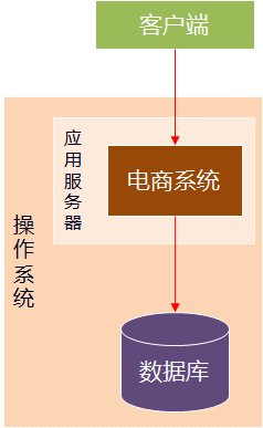 公司发展的初期,资金少、用户少,需要的软件产品的数据和并发量都比较小,这个时期大多数的软件系统只需要单一服务器就可以满足需求,所有的业务逻辑都在单一应用系统,单应用、单数据库。数据库部署在和应用相同的虚拟机或服务器上,或者放置在另外一台机器上。此时的架构图如下: