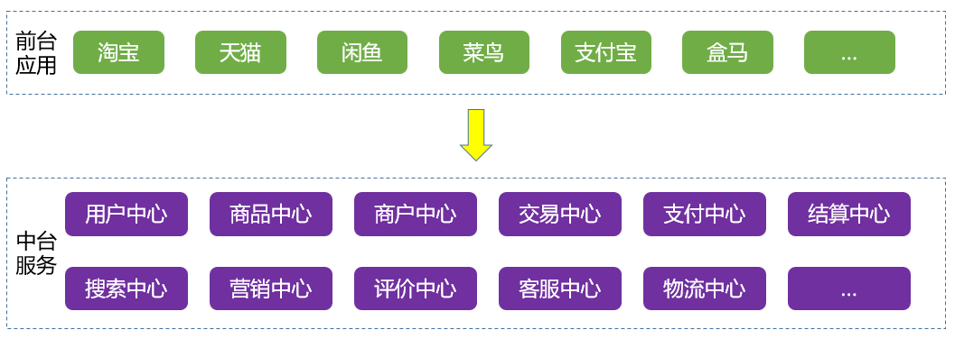阿里巴巴提出 大中台,小前台战略,就是把组件化、插件化、服务化解决方案到极致。通过产品线公共业务或者技术下沉,形成各种技术中台或者业务中台。