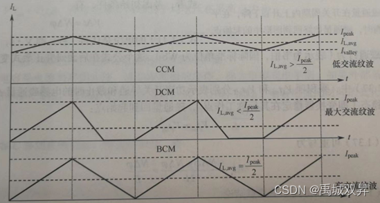 - BCM:边界导通模式:控制器监控电感电流,一旦检测到电流为0,功率开关立即闭合。控制器总是等电感电流“复位”来激活开关。