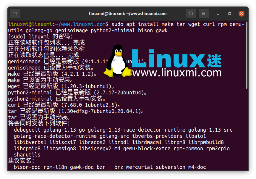 linuxmi@linuxmi:~/www.linuxmi.com$ sudo apt install make tar wget curl rpm qemu-utils golang-go genisoimage python2-minimal bison gawk