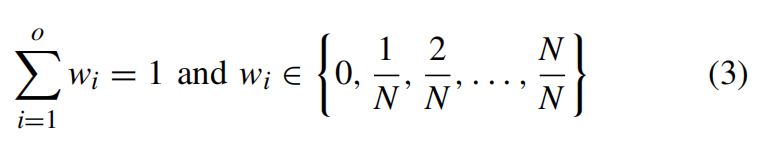 给o个目标问题,每个权向量有o个元素w = (w1,w2,...,wo),且满足上述条件。其中N是预定义的正整数,权向量的个数为