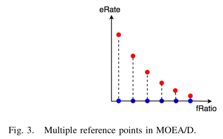 在MOEA/D中使用多个参考点的想法已经在一些研究中得到了检验。然而,这些算法根据特定的机制,每一代都会更新参考点。我们的方法在进化过程之前将参考点放置在fRatio轴上。此外,该算法中不存在权值向量。这两个差异使得我们的算法比其他多参考点的EMO算法更简单。
