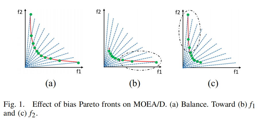 图1的任务是最小化目标f1和f2,绿色的点表示权向量的**解。当帕累托前沿偏向于f1[图1(b)]或f2[图1(c)]时,使用一组均匀分布的权值向量不能很好地工作。在这两种情况下,一些权重向量都被浪费了,因为它们没有提供任何解决方案。如果浪费的权向量位于边缘附近,在帕累托前沿边缘可以得到更多的解。