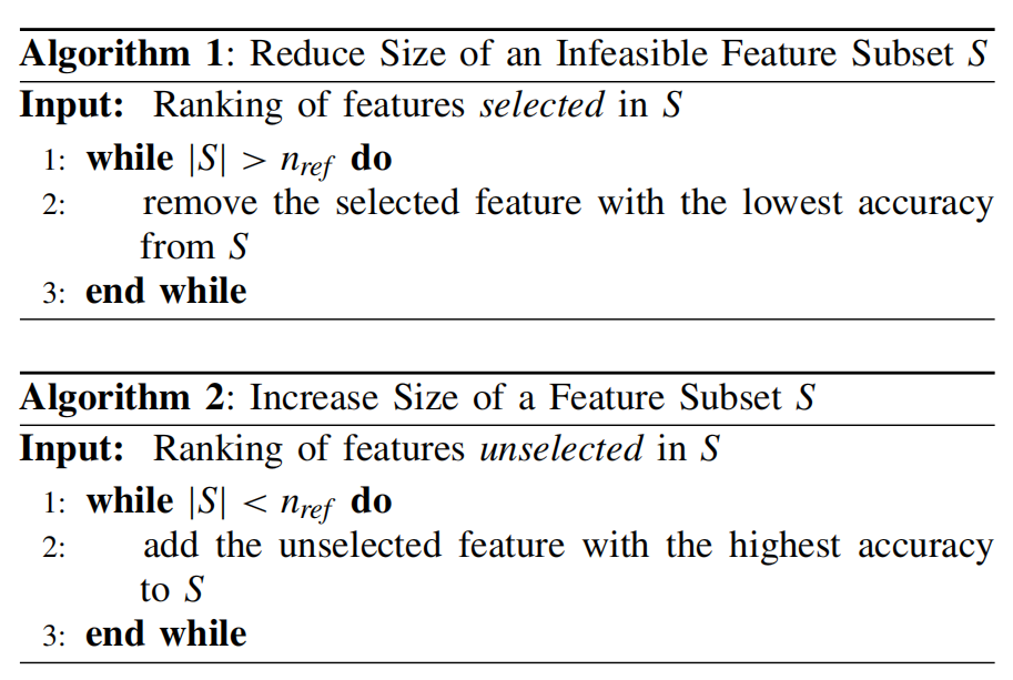 当搜索机制创建一个大于nref的候选特征集S时,修复机制必须删除(|S|−nref)特征,以使其有效。该机制选择具有最低个体分类精度的(|S|−nref)特征(在算法开始时预先计算)。该过程如算法1所示。